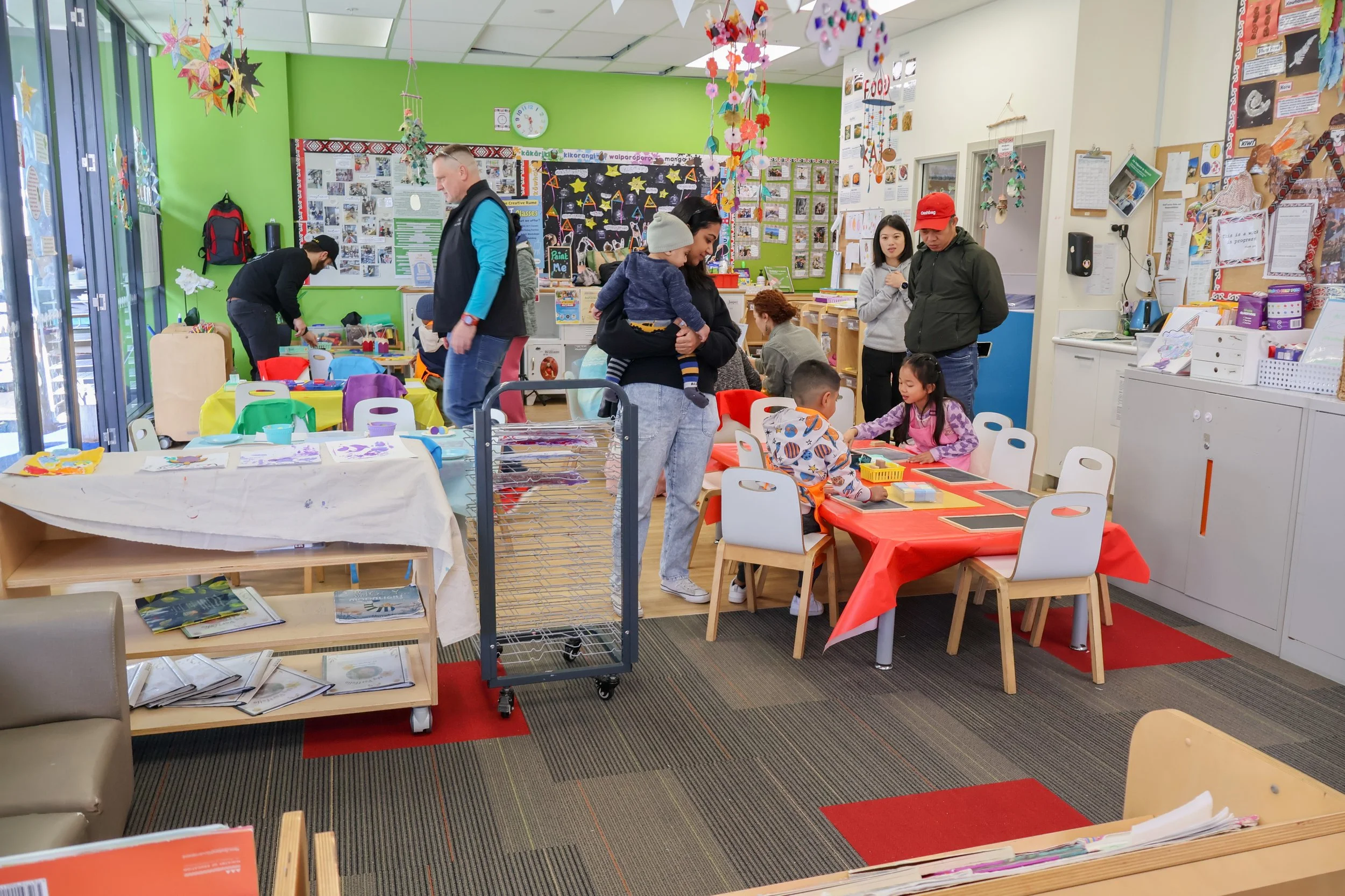 Parents and whānau joined in as well, exploring the same materials alongside their children. Finished pieces were proudly displayed to dry and then taken home at the end of the day. It was such a fun day of joyful giggles, curious strokes, and colourful messes!